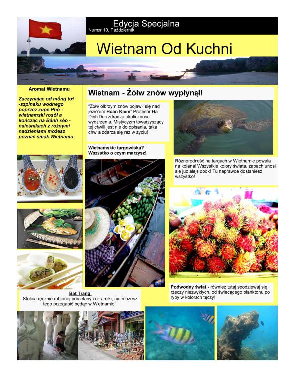 Wietnam w pigułce. Pomysł pierwszej strony rzeczywiście unikatowy w porównaniu z innymi uczestnikami konkursu. Taka zapowiedź zdecydowanie przekonałoby mnie do zakupienia nowego numeru gazetki. Fajnie, dużo kolorów, trafia do odbiorcy, jak najbardziej na plus.
